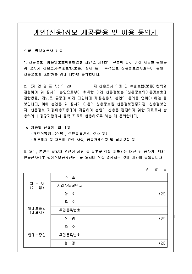 개인(신용)정보 제공·활용 및 이용 동의서 양식 미리보기